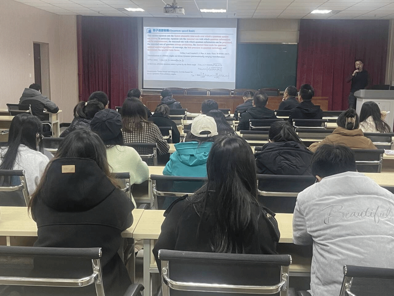 豆福全教授作了題為 “最速降線演化下量子速度極限”的學(xué)術(shù)報告。報告闡述了量子速度極限的概念及其物理背景,同時強(qiáng)調(diào)了這一問題在眾多前沿科技領(lǐng)域所展現(xiàn)出的重要應(yīng)用價值。鑒于實際量子問題的多樣性和復(fù)雜性,統(tǒng)一量子速度極限時間界限無疑是當(dāng)前研究領(lǐng)域中一項既具挑戰(zhàn)性又極具意義的課題。在報告中,豆教授還分享了課題組在這一領(lǐng)域取得的最新進(jìn)展:提出了一種創(chuàng)新的基于黎曼度規(guī)的量子最速降線幾何方法,獲得了任意量子系統(tǒng)的量子速度極限估計式,成功地將該理論推廣至更為復(fù)雜的開放量子系統(tǒng)。與會師生與豆教授就量子速度及復(fù)雜量子系統(tǒng)特性等話題展開了熱烈討論,會場學(xué)術(shù)氛圍濃厚。