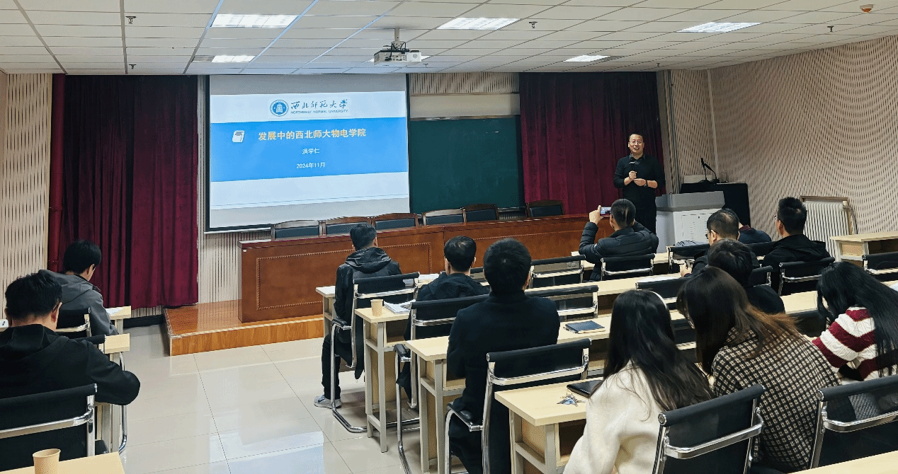 副院長洪學(xué)仁以“發(fā)展中的西北師大物電學(xué)院”為題,詳細(xì)介紹了西北師范大學(xué)物理與電子工程學(xué)院的概況、師資隊伍、教育成果、實驗平臺以及學(xué)位點建設(shè)等情況,和副院長王濤一同回答了與會師生的提問。