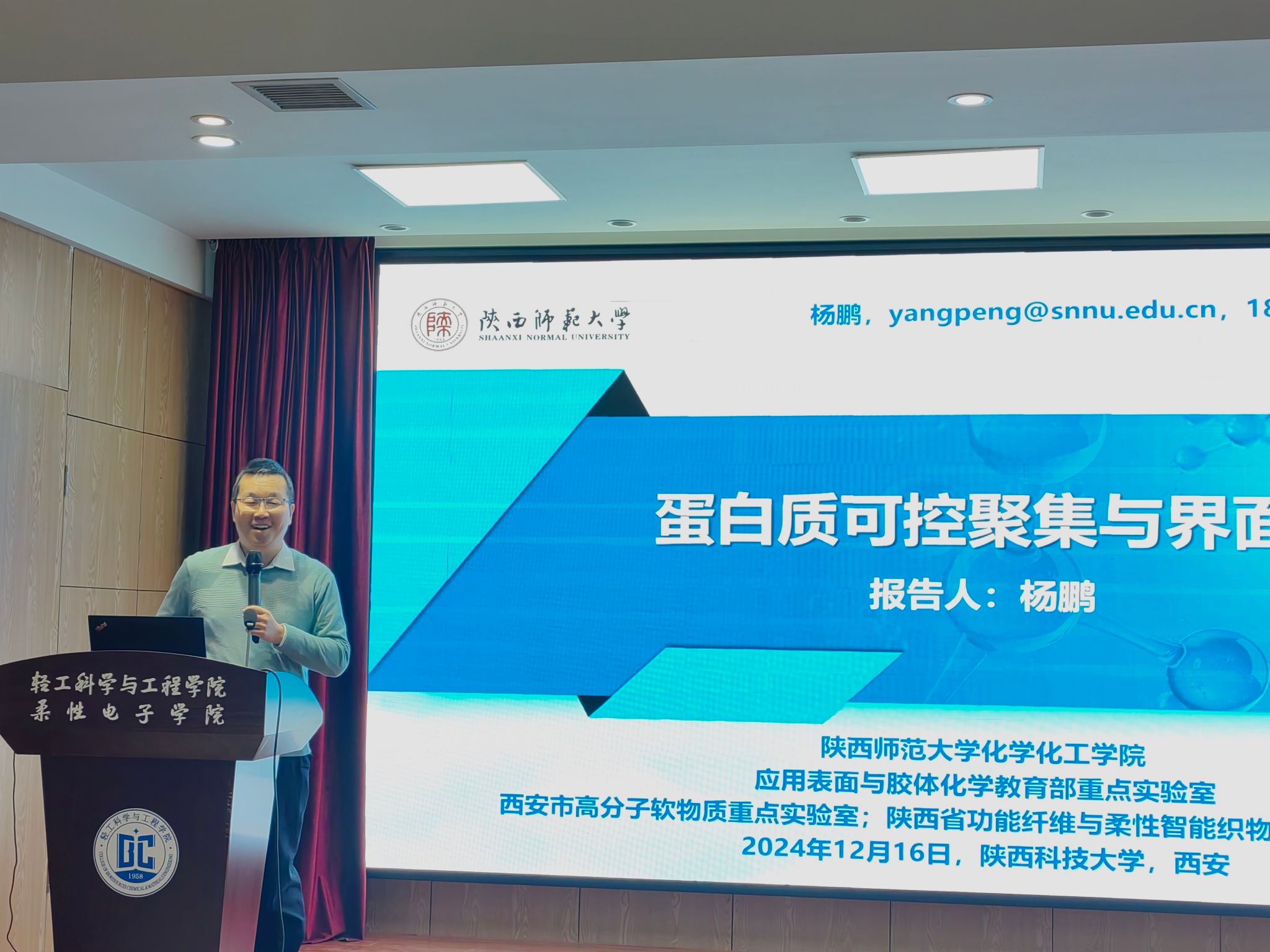 12月16日,為進一步促進學術交流和合作,拓寬師生的學術視野。應我校輕工科學與工程學院(柔性電子學院)、國際合作與交流處及科技處邀請,陜西師范大學楊鵬教授做客我校“前沿科學報告”,做了題為“基于蛋白質聚集的生物質材料”的學術報告。報告會由國際合作與交流處處長張素風主持。輕工學院相關專業(yè)師生參與了本次報告會。