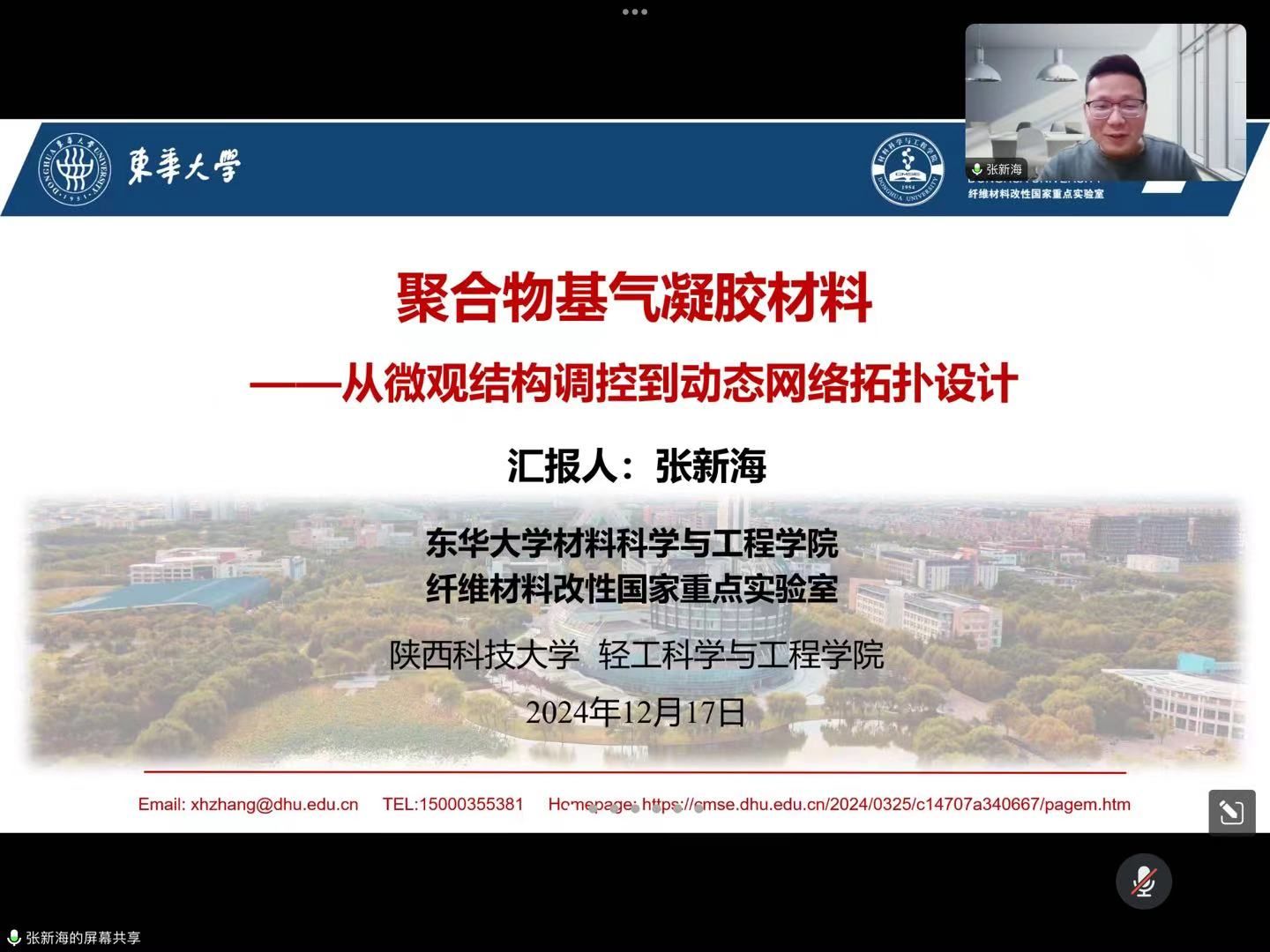 12月17日,應輕工科學與工程學院(柔性電子學院)和研究生院邀請,東華大學纖維材料改性國家重點實驗室副研究員張新海做客我?!拔囱雽熣搲?,作了題為“聚合物基氣凝膠材料—從微觀結構調控到動態(tài)網(wǎng)絡拓撲設計”的線上學術報告,輕工學院相關專業(yè)教師、研究生及本科生參加了本次報告會。
