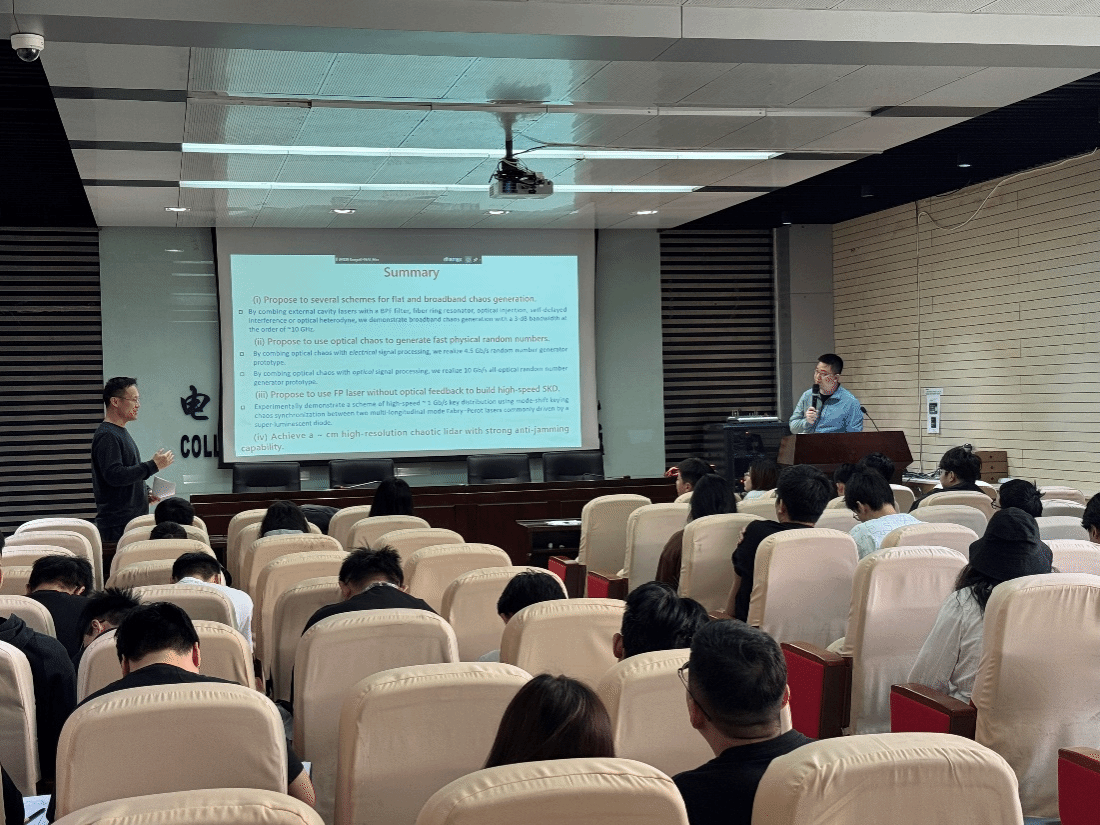 報告結(jié)束后,李璞教授與現(xiàn)場參會的師生們圍繞混沌光學(xué)及相關(guān)領(lǐng)域的專業(yè)問題展開了熱烈而深入的探討。面對師生們踴躍提出的疑問,李璞教授以極大的熱情和耐心,逐一給予了詳盡且富有啟發(fā)性的解答。此次學(xué)術(shù)分享不僅極大地拓寬了師生們的學(xué)術(shù)視野,使大家對混沌光學(xué)在現(xiàn)代科技中的重要地位有了更為深刻的認(rèn)識,同時也為相關(guān)領(lǐng)域的研究工作提供了新的思路與方向,激發(fā)了師生們對科學(xué)探索的濃厚興趣。