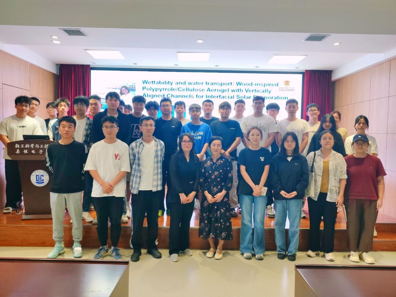 呂清葉教授首先介紹了在加拿大卡爾加里大學的科研環(huán)境與實驗室建設(shè)情況,分享了國際科研工作的經(jīng)驗與感悟。隨后,重點闡述了團隊在生物聚合物復(fù)合材料方面的最新研究成果。通過引入仿生設(shè)計理念與分子間相互作用調(diào)控,研究團隊構(gòu)建了兼具功能性與可持續(xù)性的創(chuàng)新材料體系。在環(huán)境治理領(lǐng)域,基于生物混合物的多孔吸附材料展現(xiàn)出高效廢水處理、催化及抗菌等應(yīng)用潛力。在材料設(shè)計方面,團隊提出“軟硬結(jié)合”策略:柔性聚合物鏈賦予材料優(yōu)異延展性,而剛性納米粒子提供結(jié)構(gòu)支撐,從而使材料在反復(fù)彎折過程中仍能保持穩(wěn)定性能。